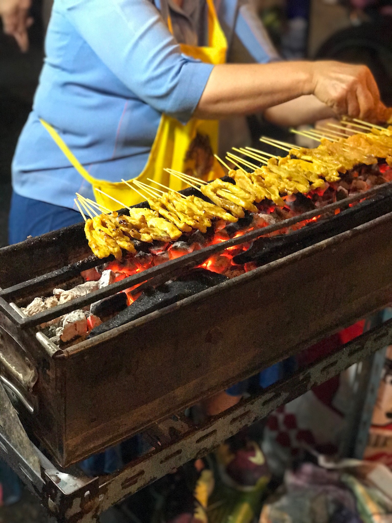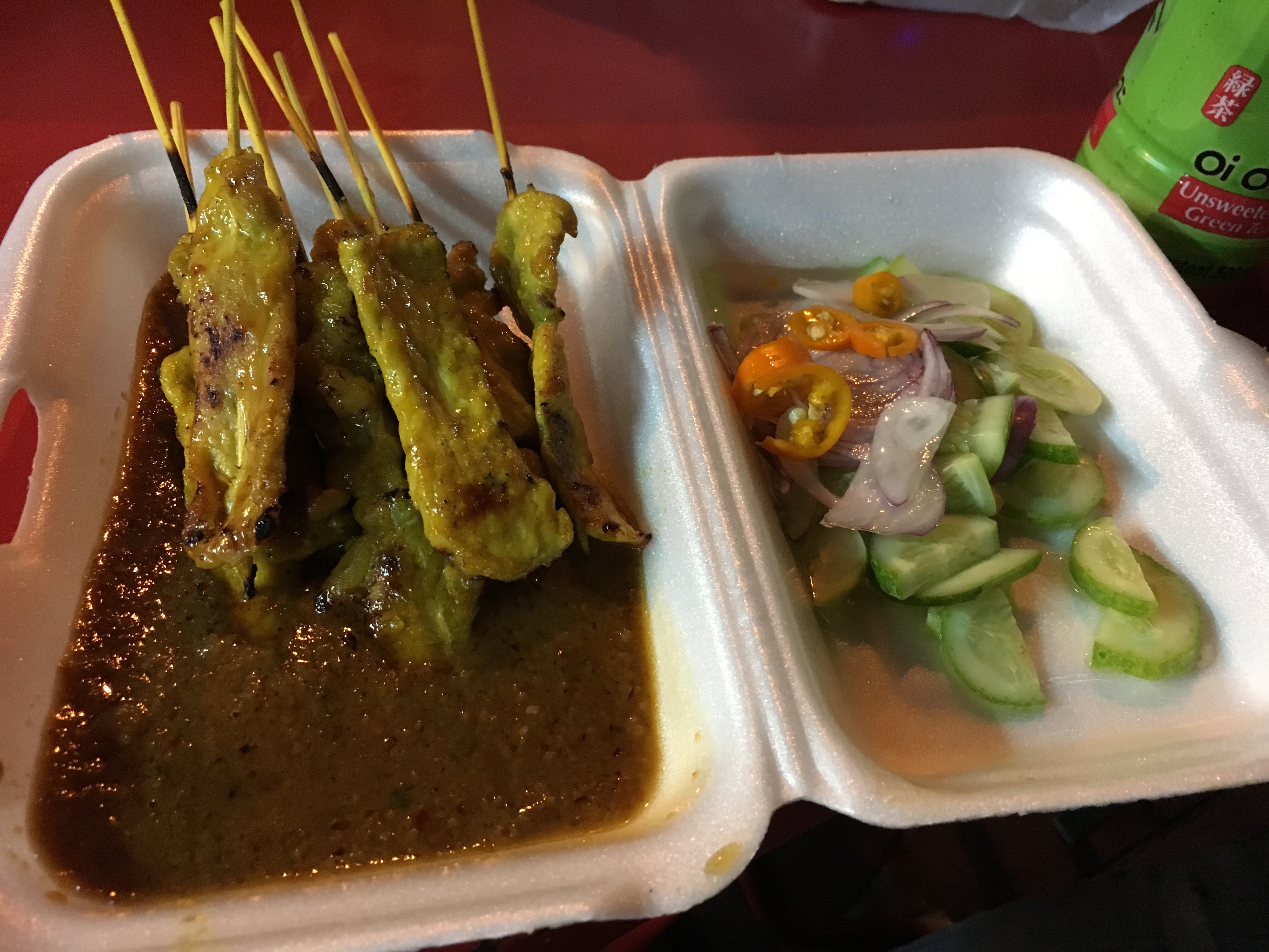 As soon as we walked out, we noticed how busy the streets were. A lot of people were gathered around this seafood restaurant but the line up was too long for us tonight, since we were really hungry and wanted food right away. We kept walking and saw many seafood restaurants and shark fin and bird’s nest restaurants. There were also many fruits vendors, the most popular of which was the king of the fruits – the durian. We read there was a lot of good street food here but where were they all hiding. We finally found gold when came across a small street with many busy food stalls. To be consistent with our noodles-as-our-first-meal-at-any-new-destination tradition, we sat down for a plate of Pad Thai. We could not read the menu at all so we just said “Pad Thai?” then stuck in 2 fingers. We were happy that they were snack-sized, so we can try other food. We enjoyed how it wasn’t too sweet, like some of the ones we’ve had in Canada. There was a good mix of vegetables and we noticed it was a vegetarian version, with tofu and no meat. We then paid our 45 Bahts (~$1.73 CAD) and were on our way to the next stall. It is interesting how whenever there are multiple prices on a menu either here or in Vietnam, we always end up paying the higher price. I don’t mind paying more if they actually gave us the larger size or the more expensive option but I hope it’s not the mere fact that I am a tourist that I have the pay an inflated price.
