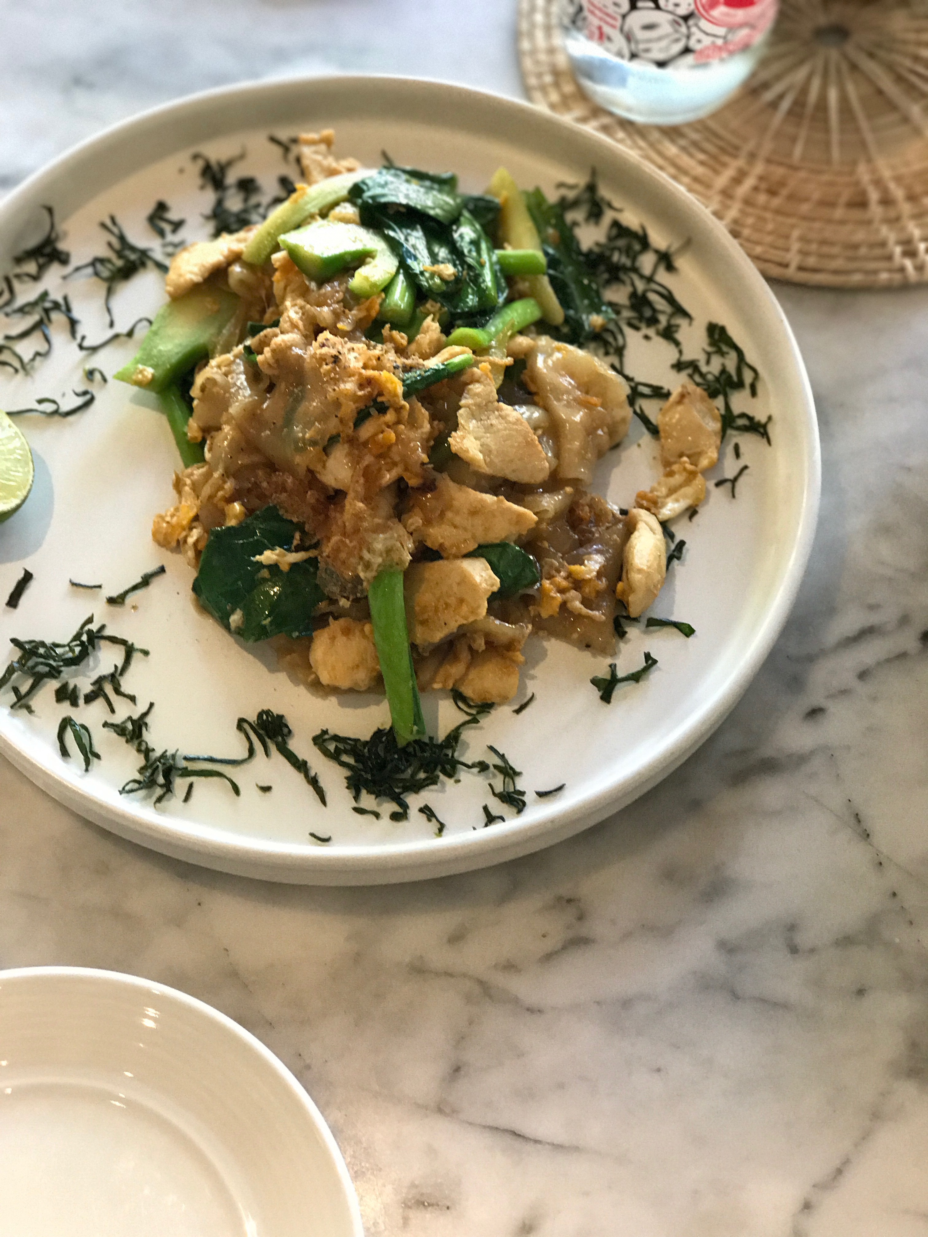 What I really wanted was to just chill in an air-conditioned place for a while. It was time for lunch so we went across the street to Elefin Coffee. We ordered some drinks to cool down. Aaron had their cold brew, which he thought could’ve been better and I had their lychee soda, which was very refreshing. Just like the lemon sodas I’ve had in Vietnam, they gave me all the ingredients and I mixed it myself, so I was able to control the amount of lychee syrup to add, which I appreciated! For food, we had their Tom Kha Kai, Pad Si-ew and lemongrass chicken. The Tom Kha Kai was a lot more coconuty than what we’ve had in Canada, but otherwise very similar in taste. The Pad Si-ew used very broad noodles, almost like lasagna, and was pretty tasty. The lemongrass chicken was also good. Overall a pretty decent meal for an assumed touristy place since it was right across from the Wat Pho.