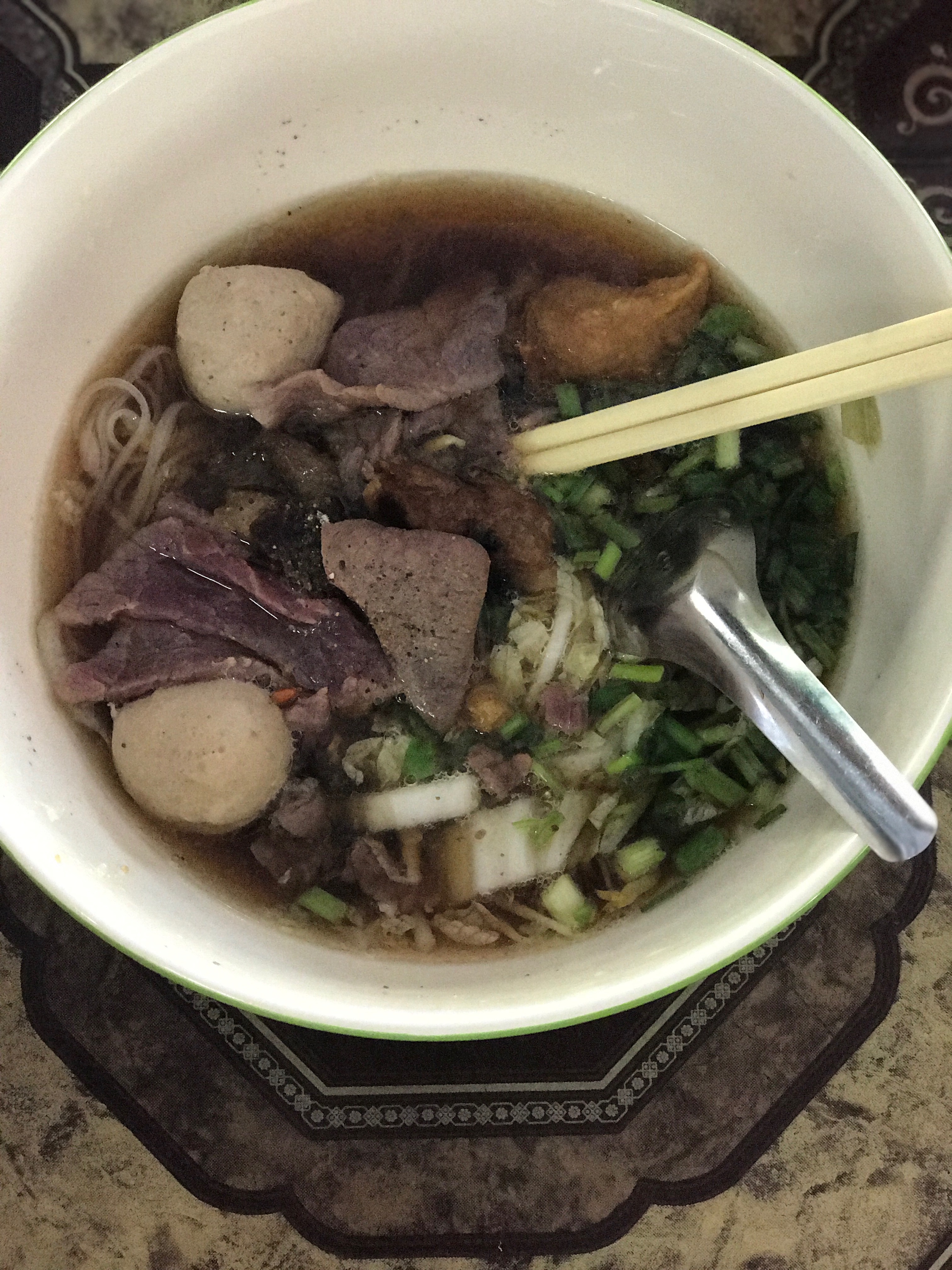 Then we had a break for lunch. There were many restaurants along the Main Street of the temple, and we just stopped at the first restaurant we saw (กวงราดหน้า) because it looked too good to keep going. They were serving crispy pork with rice as well as different noodle soups. We originally wanted the rice but they were out, so we ordered to noodle soups. Aaron had the beef and I had the pork. Aaron’s came first and that broth was rich and so tasty. My pork noodle soup was still really delicious with some slices of pork, meatballs and crispy chips, but if you are looking for a rich taste, you should choose the beef. We only realized after our delicious meal that we should probably have had a vegetarian meal, to be in the spirit of today’s course; however, our natural tendencies towards tasty meat cannot be ignored. We still had some time, so we walked around and finally got to try the little taco-like treats from a street stall. Surprisingly, these treats are actually sweet! It was a thin, crunchy crepe-like shell with a cream in the centre along with strands of unknown stuff! We wanted one of each type but it turns out one order is a whole bag of them! I preferred the dark orange one as it had more flavour, indeed a bit savoury. The yellow strands were a bit bland.