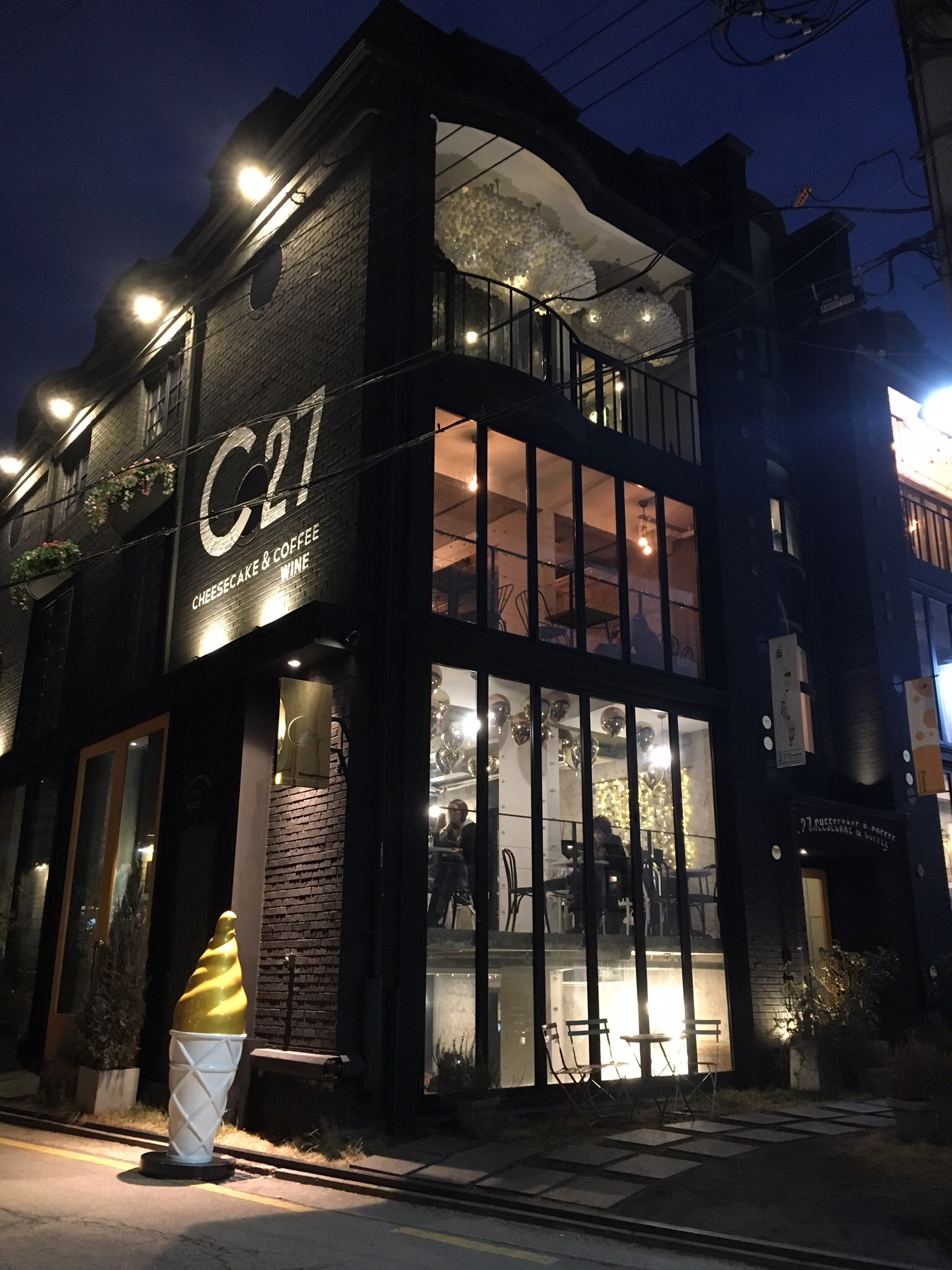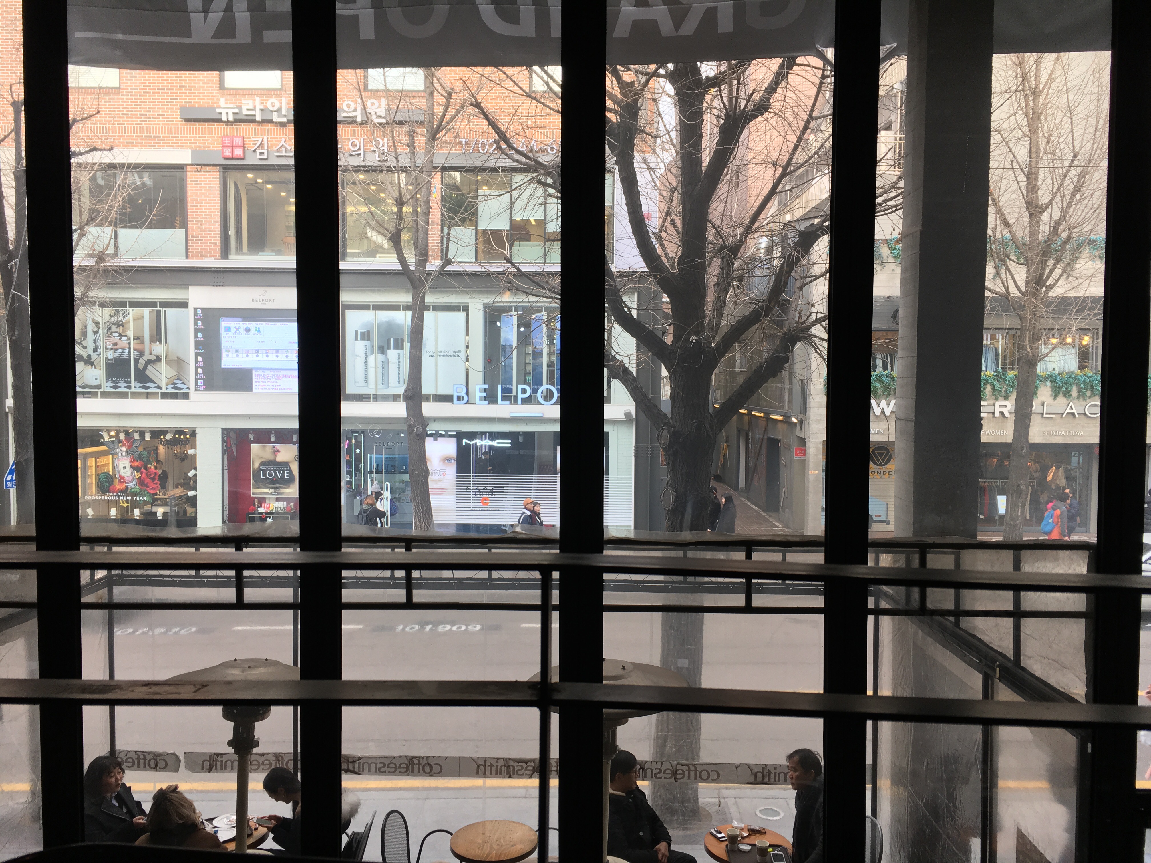 We’ve seen quite a few Coffeesmith’s around Seoul, but haven’t had the chance to visit one, so we decided to check this one out. It was huge with plenty of seating. It’s been a while since I’ve heard some American top 40 so that was really nice. Aaron had their cappuccino and we shared their cheese soufflé cake, which was actually not bad. We sat upstairs facing the large windows, perfect for people-watching. The table was actually a large monitor, with input USB ports. It turned on at one point when we tried to charge our devices. There was a designed smoking room, but it wasn’t entire airtight; therefore, there was, unfortunately, a slight smell of cigarettes in the coffee shop.