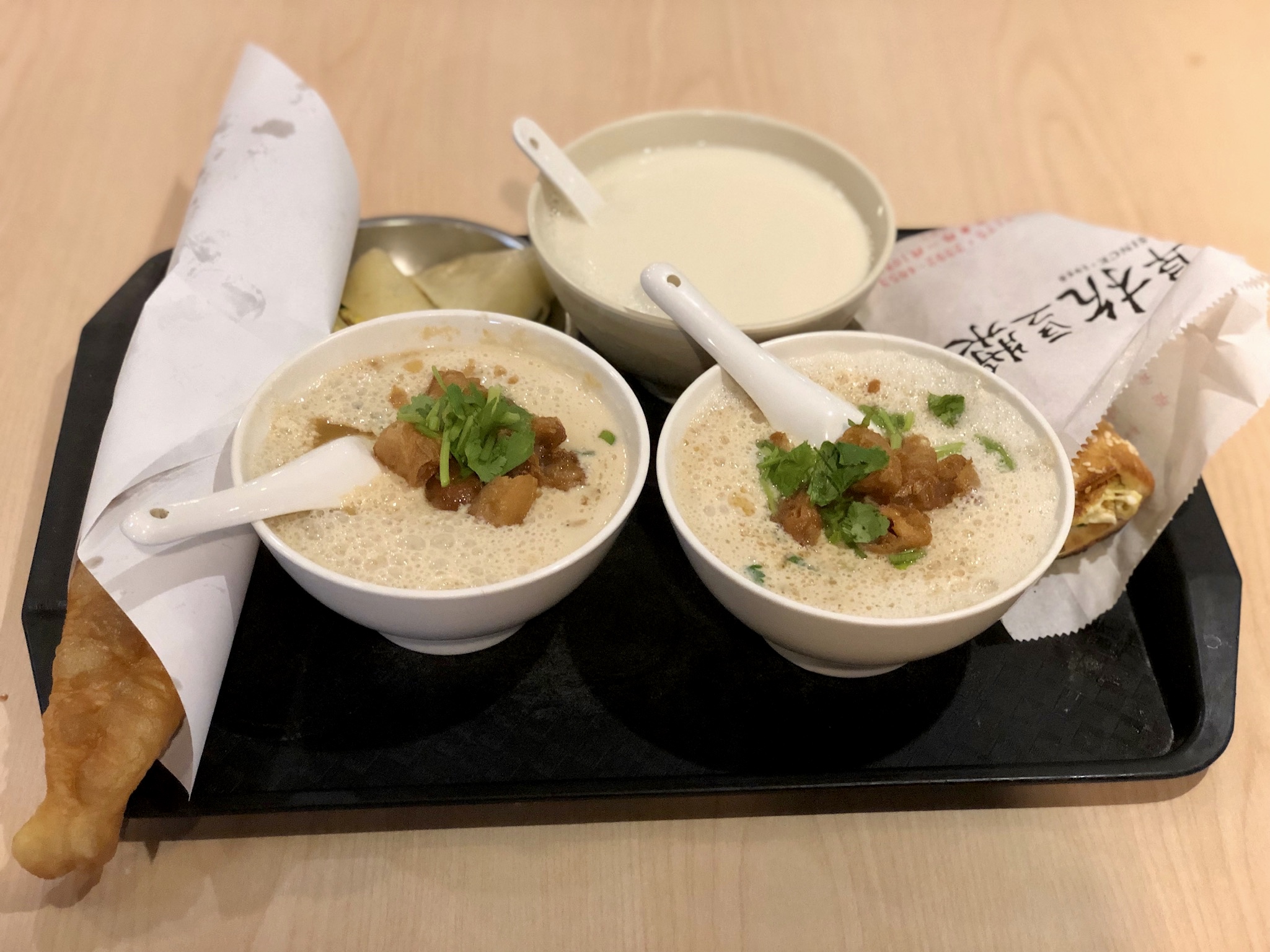 We had an idea of what we wanted to order so I was semi-prepared. There were 3 areas – one for ordering soy milk, one for other food items and lastly the cashier. I quickly ordered my soy milk choices – 2 salty and 1 sweet (cold). Then the food item aunty was getting impatient and asked us to just order using the numbers. It was interesting to note that the entire menu was in Chinese, which luckily I could read but what for those who couldn’t – either bring a friend who could or figure out the number which you want ahead of time or else these efficient aunties will not be pleased.