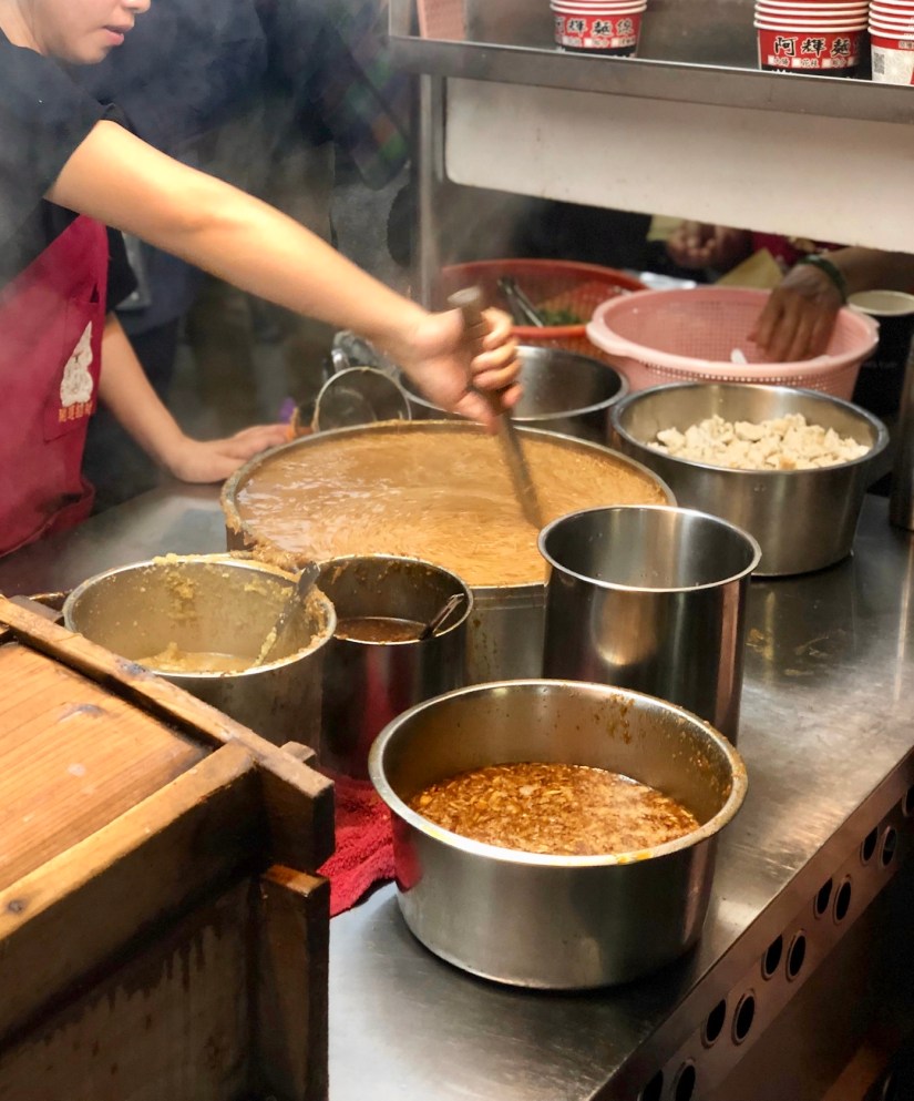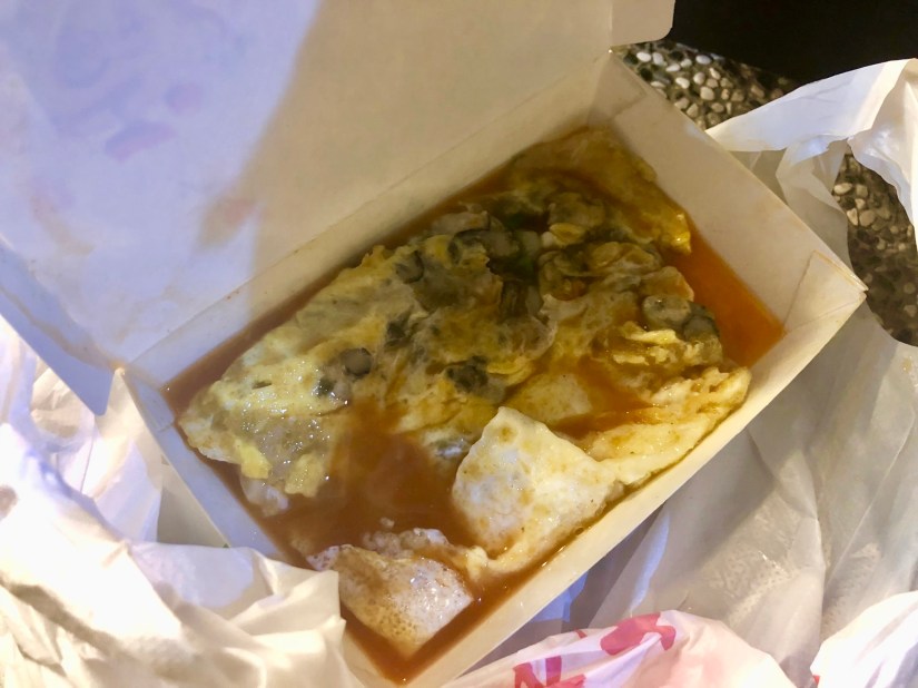 We hadn’t had any oyster omelette (oh ah jian 蚵仔煎) yet at this point and luckily, we passed by a restaurant which was cooking up some of this in the store front. After staring at it for a while, the lady asked what we wanted and I pointed at it and said “THIS ONE!”. I did not know how to say it because this dish is typically pronounced using the Hokkien dialect. She asked us to step aside while the chef worked his magic. The lady efficiently packaged everything to go and we were on our way with our take-away oyster omelette. It wasn’t what I expected, to be honest. It was soaked in a lot of sweet sauce. I usually love raw oysters but I felt oyster tasted too much like ocean here, even though it was cooked. I was kind of disappointed as I was expecting more.