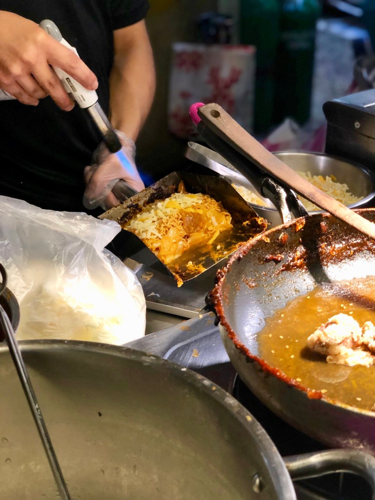 Next, we walked by a Korean-style fried chicken and noodle food stall. I know, we were not in Korea, but it looked so good that we had to back track to line up for it. It was a very elaborate cooking process. First, he had to coat the fried chicken in the sauce. (We chose red sauce with the spicy gochujang. You can also get the brown sauce, which was non-spicy.) Then he added some other ingredients including rice cake. He boiled the noodles along with some cabbage and then added all this to the frying pan. He then transferred all the above to another small pan in which he topped it with cheese and used a torch to melt the cheese. Voila! The meal is served. After some mixing, we took the first bite and it was very delicious. I don’t regret getting it one bit.