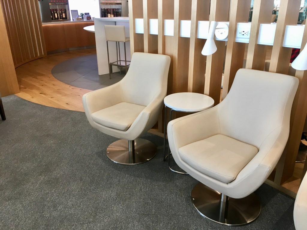 We arrived at the lounge around 11:30am and it was very busy. As soon as we got out of the elevator, there was a newspaper stand, then immediately behind there is a Business Centre with a computer, printer and a few office chairs in a half-moon configuration. It was fully occupied at the time, with some patrons in an intense team meeting. As we keep walking, there was plenty of seating with many outlets for charging electronics. The space itself is not too big but it’s located on the top floor with lots of light given the surrounding glass walls. I really enjoyed the ambience. There are also space-separating walls so you don’t have to feel like you’re in a fishbowl. To the right, there is a wine bar. Behind there are two loungers to put your feet up if needed. The lounge is only about 2 years old but the loungers appear to be in rough shape as the pillows are ripped. Some of the other seating is also in bad shape, there was a chair, which we were going to sit on that was badly stained. There is a bridge with more seating along the walls, leading to the food section.