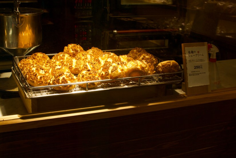 After breakfast, we went over to Kurokawa Onsens to check out some shops now that they are open. There were various gift shops, coffee shops and bakeries. We were enticed by the smell of butter, so we walked into a bakery selling giant profiteroles. We got one along with a light roll cake. The profiterole was scrumptious and was filled with smooth cream. Aaron reports that the dairy in this region is supposed to be very good and it was evident.