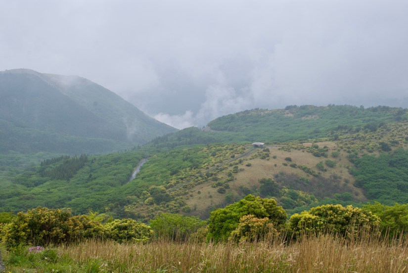 After our snack, we decided to drive over to the Oguni town rest stop to kill some time since it was still raining. We had wanted to go to the Soba Noodle Road for lunch but the sky suddenly cleared up so we saved time by picking up some sandwiches from a convenience store before driving to the hiking trail head. We saw a few people returning from their hikes and their pants and shoes were covered with mud! Most of the hikers appear to be in their 70’s and older and were all in legit hiking gear with hats and hiking sticks. Here we were looking not properly dressed but we ventured on anyway. It wasn’t long before we reached the first rest stop and took the chance to eat our sandwiches and to enjoy the view. It was still a bit foggy at this time but at least the rain has stopped. After this first rest stop, we were above the mist so we couldn’t really see too much. It did make the trail look very magical though. Some of the course was very challenging with ladders and chains. I was really impressed by how the 70 and 80 year olds were completing this trail. That’s amazing! We did not have time to go to the second peak but we were able check out many of the lookouts. Luckily for us, the sky cleared and we were able to get a nice view from the lookouts on our way down. The purple azalea accents peeking out from the beautifully green hills was such an amazing sight. Soon, the memory card in my camera was full, so it was time that I used my eyes to take some mental images.