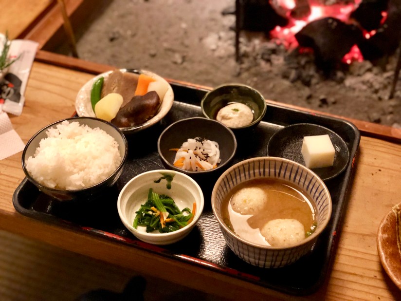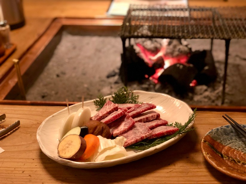 Our villa was very close so we were able to stop by for another relaxing bath before going to dinner. We were prepared today and had stopped by the restaurant earlier this morning to make a reservation to ensure that we will not have to stress about dinner like we did last night. やまたけ was a BBQ restaurant which was recommended by the nice man at our resort last night. It has traditional Japanese seating. We were the first guests to arrive for dinner but it got very busy by time we left. We both ordered the beef dinner set. Then the lady helped us start the charcoal grill and we were given some pickled vegetables for starters. Next, the beef and various vegetables came including mushrooms, carrots, cabbage, yam and onions. We were a bit disappointed to see that the beef was frozen, so the taste and texture was not the best. The vegetables were interesting. I’ve never had grilled cabbage but it actually was not bad. Our dinner set came with other vegetables, soup and rice. For dessert, there was a sweet tofu pudding as one of our sides. At the end, when we had to pay for our meal, I realized that I did not bring my wallet! Aaron had limited cash and we were both panicking and kept searching our pockets and purse. We were short around 500 yen and said we would go back to the hotel to get some more cash. The lady was very generous and said we did not need to go back to the hotel. Instead, she offered us the sake for free, taking it off the bill! We were very embarrassed but bowed, said our thank you’s and sorry’s and were off. Reflecting upon how nice everyone is here, we went back home for another bath, breathing in some fresh mountain air, before calling it a night.