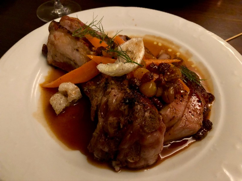 Aaron had the braised short rib which he also seemed to really enjoy. It definitely had him eating off the bone so that must be a good sign. Aaron asked for another wine to go with his main and it was suggested that he try an organic orange wine. It was very interesting and unique. It did have an unusual aftertaste though so it might not be everyone’s cup of tea.