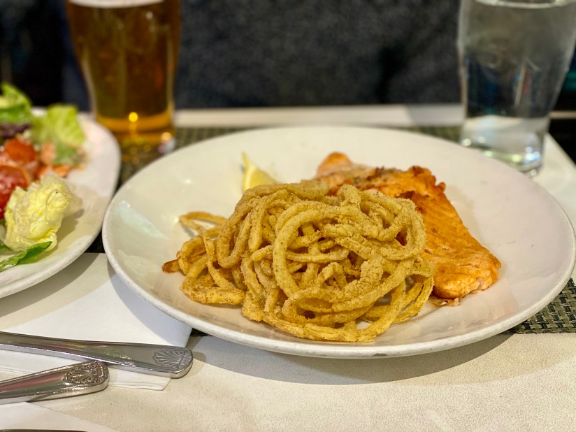 After picking up our bags from the hotel, we were off to the Boston Airport. Our flight was delayed due to the weather but there was plenty of seating and various seating (comfortable couches, normal airport seats as well as plenty of high-top working stations by the window). We took a seat by the window and got some work done before getting hungry again. It turns out they had a Legal Fish Bowl at the airport too. We felt like one last meal of seafood so here we go again. I had the crab and avocado salad while Aaron had the salmon with onion strings and salad. My salad was quite interesting as it was a ball of shredded crab meat on top of cucumbers, tomatoes and avocado. I was expecting more greens but that’s ok because Aaron’s meal had some so I just had some of his. Aaron’s salmon was good but we’ve decided that his home-cooked salmon is probably better than most salmon we can get at restaurants. The onion strings were very good though. Aaron also had one last pint of local beer as a toast to our journey here in Boston.
