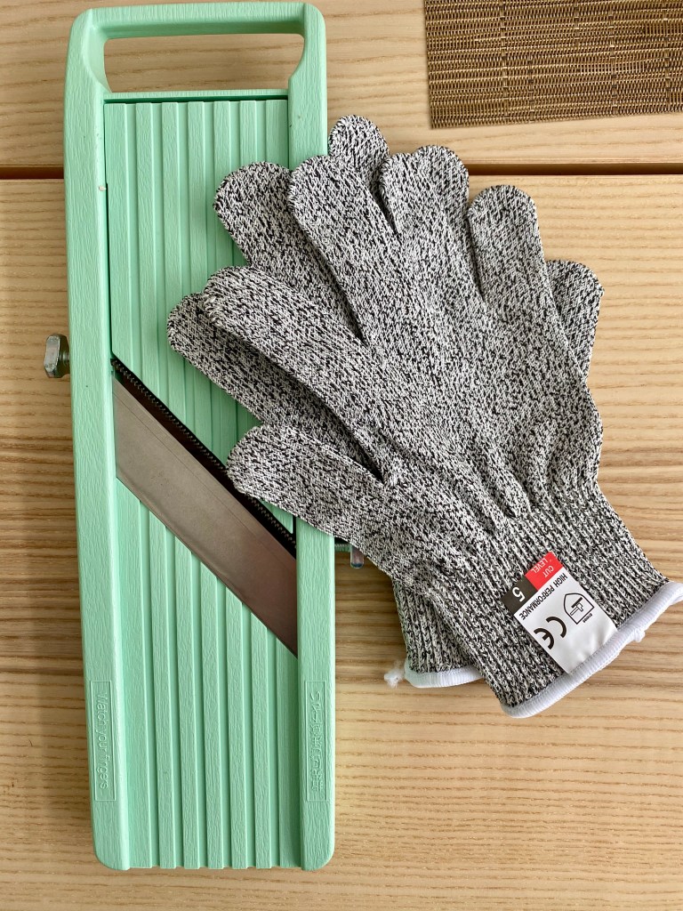 We recently purchased a mandolin for our cooking needs, so we thought we would share our experience as well as some recipes using this new tool. We have the Benriner Japanese Mandolin and we also purchased some heavy duty cut-resistant gloves to protect our fingers. There is an attachment that comes with the mandolin but it can be cumbersome to use and also creates more waste as a lot of the vegetable remains uncut.
