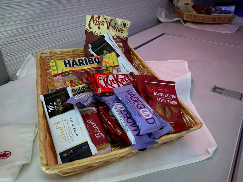 Throughout the flight, snacks were provided at the front of the plane (AKA right in front of me). I appreciated the easy access but I felt like privacy was somewhat compromised people would frequently come up throughout the flight to grab their snacks. There was a good assortment of chips, chocolate, granola bars and candy. I was pleasantly surprised they stocked some MadeGood bars which were allergen-free!