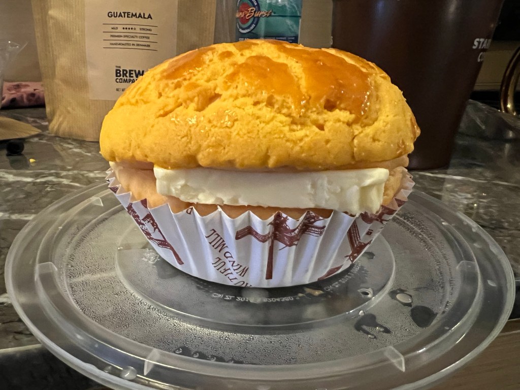 Good morning Vancouver! Family decided to visit this morning before we had to go to the airport and they were so very kind to bring some breakfast for us from Kam Do Bakery. This busy Chinese bakery 3 minutes away from the hotel is known for their pineapple buns as well as wintermelon wife buns. I was not aware that they also serve classic HK breakfast items such as sandwiches and noodle soups. I had the ham on macaroni soup whereas Aaron got the satay beef with instant noodles. Having tried Aaron’s very tasty soup definitely made mine taste bland. We got the pineapple bun with butter and they were not kidding with their butter. It was a good 1/2 of an inch slab of butter sandwiched between the pineapple bun. Delicious – yes. Probably too much for my stomach/body to handle – also yes.