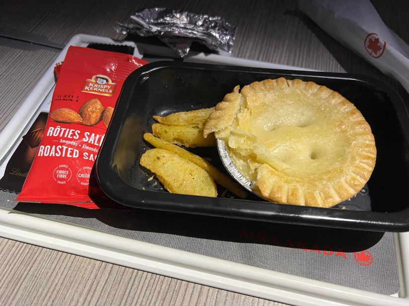 Mid-flight, there was also a chicken-pot pie mini meal which was nice and hot. The taste was standard. It came accompanies by baked potatoes which were bland as well as some packaged almonds and full sized dark chocolate bar.
