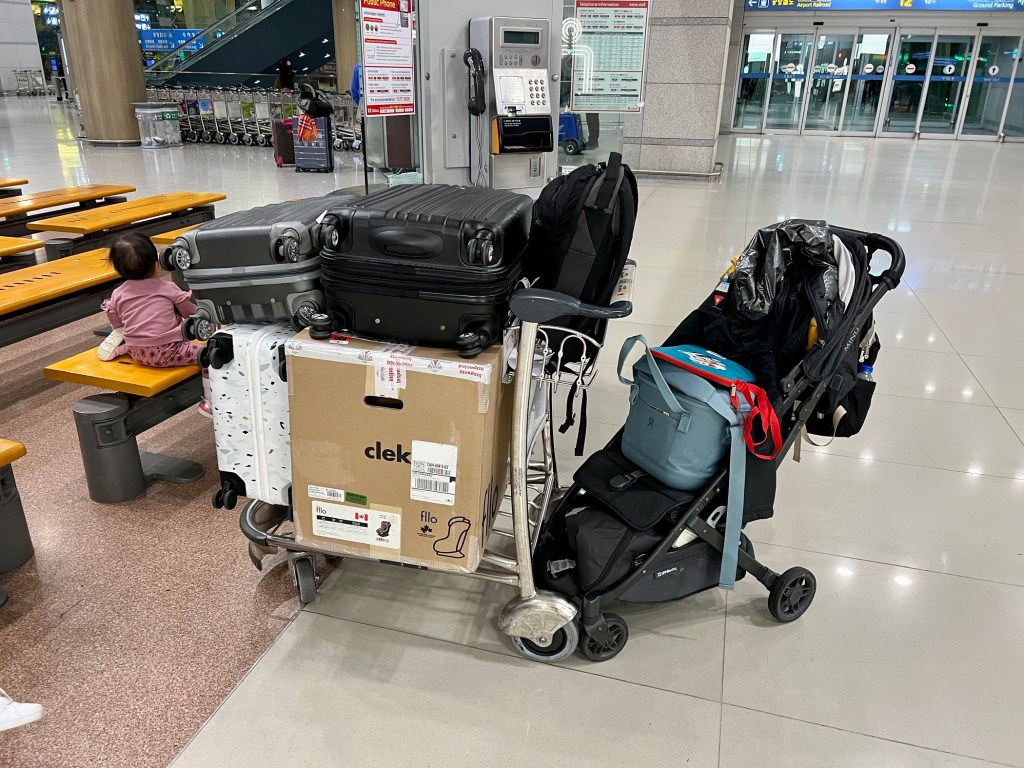 ICN is a huge airport. Once we entered, there were swarms of people coming left right and centre all heading towards the baggage claim. We had filled out customs papers on the plane already, got our K-ETA approved as well as gotten our Q-code for covid screening. They did not check the K-ETA at all. There were signs with a scannable QR code for the Q-code website so people were doing that as they were making their way to immigration causing a bit of a backlog as everyone was looking at their phones. It was very zombie like and creepy in some way. As usual, with the baby in tow, we were able to go to the priority line and went through immigration quickly once we passed this bottle neck. Picking up our baggages was again easy as we were one of the last ones to arrive at baggage claim. Definitely a waste of the priority baggage handling benefit. Nevertheless, we handed in our declaration forms and we were finally free. We were waiting for family to join us from a different flight so we decided to use this time to find baggage storage to hopefully store some extra baggage we didn’t need for the night. There weren’t clear signs for this or information on their website, so we had do quite a bit of walking and asking for directions to find the storage company HanJin Express. Unfortunately, after all this effort, they said they were full and unable to take any further baggage. I guess we’ll have to find a big transportation to carry all our stuff! Gone are the days of travelling just with one carry-on only!