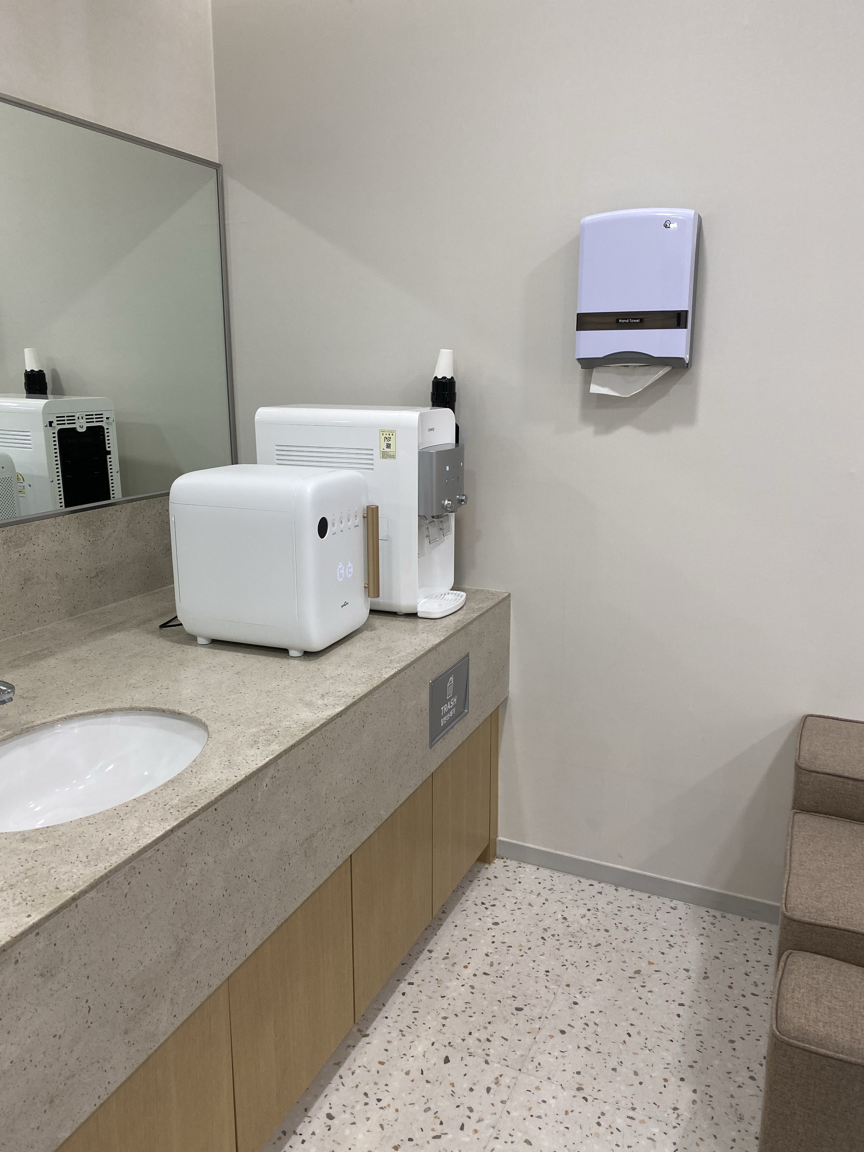 After allowing baby to run around in the play area and doing a final change in their very clean and well equipped “baby care facility” we were at the gate. I was initially disappointed that there weren’t a lot of “family rooms” at the washrooms but these facilities which are few and far between in the airport are a lovely option if you have a baby to care for. They have a changing area, 4 nursing rooms, and a resting/bottle preparing area as well.