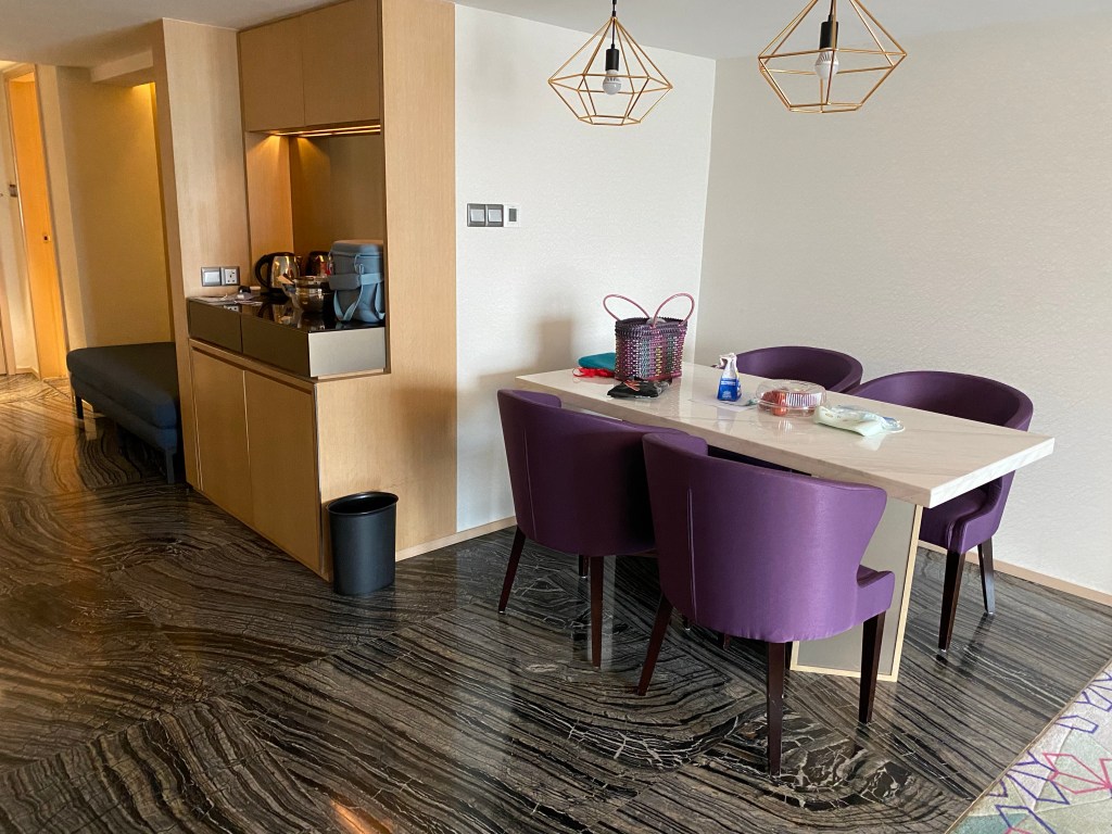 Here, we finally didn’t have to worry about transportation as family picked is up from the airport (so nice!). The hotel we booked is pretty close to the airport so after a short ride, we arrived at Le Méridien – our accommodation of choice for this first part of our trip. As we had to make changes to our trip last minute, we were not able to check into our Airbnb quite yet. Thanks to our family member’s Marriott Bonvoy Elite status, we were able to get a love spacious suite this time. There was a dining and living area with a powder room when you first enter and then a bedroom and ensuite with shower and bath inside. The only downside is the lack of counter space, but luckily, I had purchased a hanging toiletries bag for this trip so this wasn’t an issue for me. After feeding the baby some freshly cooked ridge porridge and spending some time with family here, we were off to bed. With the extra space, we decided to move the crib into the living space instead of the bedroom.