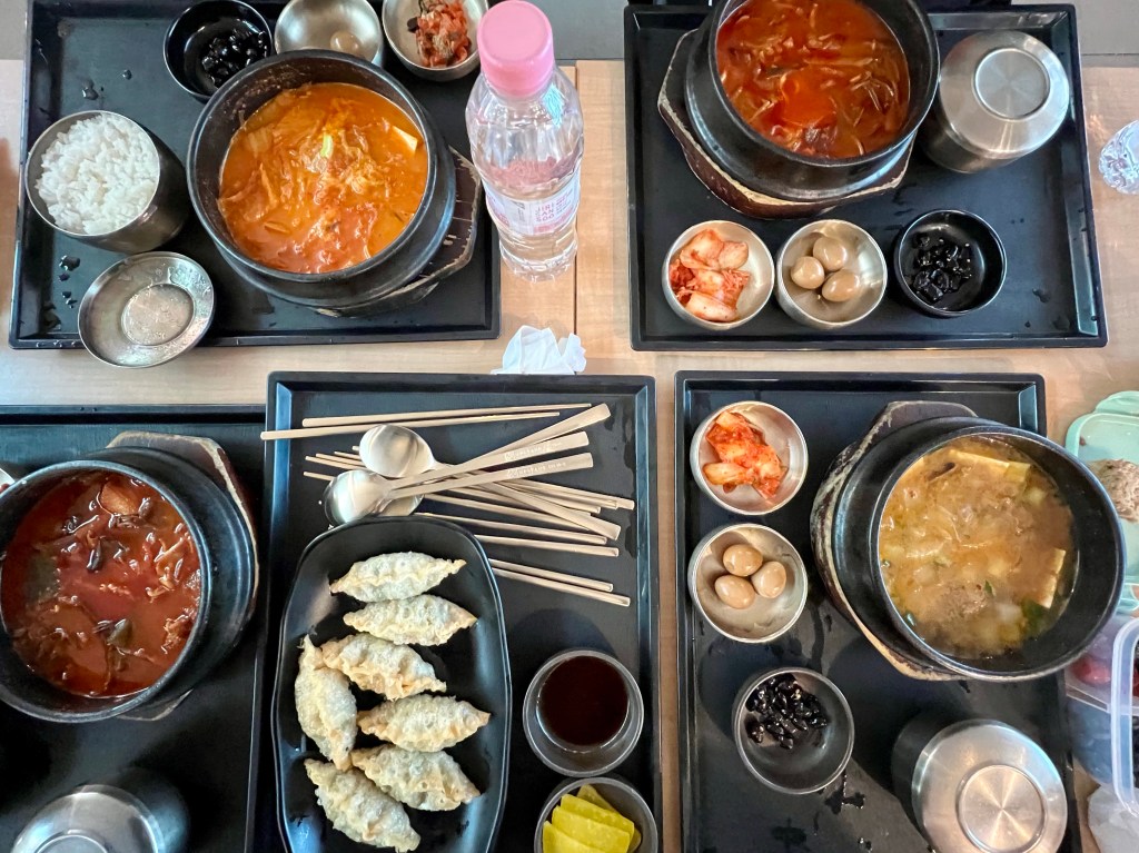 After a quick nap for the baby and packing for us, it was time to board another taxi back to the airport for our final flight to Kota Kinabalu. We were flying with JinAir today and arrived 3 hours earlier as we had previously bad experiences with ICN airport. The line up was long and we were able to check in our bags after 40 minutes. We were then told to wait 5 minutes for “baggage inspection” afterwards. I had no idea what was going on and how people would know that their bags were selected for inspection. We saw some people standing outside a door and were called in one at a time for “baggage inspection”. There wasn’t a long line up so it seems like it’s for a select few but again there were no screens and no announcements, so I don’t know how these people knew they were to stand in front of that door. After that confusing experience, we breezed through security again via the priority line. A couple of us had the Dragonpass (previously Priority Pass) but Aaron feels that lounges don’t tend to provide amazing food, so we headed to the food court instead on the 4th floor. It was packed but we were able to get a table after some hovering. The food options were Vietnamese, Korean and Taco Bell lol. We, of course, wanted Korean, so we each got a set meal of various stews, side dishes (black beans, marinated quail’s eggs, kimchi) and rice. I could eat this type of meal all the time! I particularly liked the quail’s egg and black bean banchan. We also ordered some fried mandoo to share and I don’t usually like fried dumplings but the filling was quite tasty and the side dish (pickled radish) was so delicious.