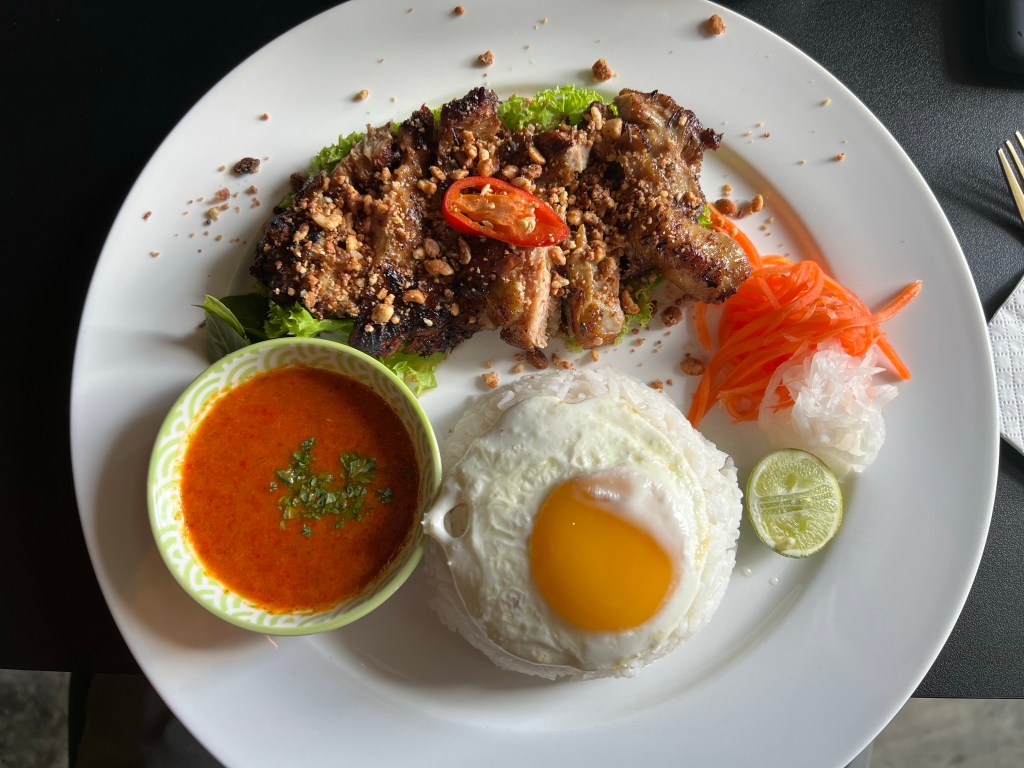 For lunch, we headed over to Gariana’s Vui Vẻ Modern Vietnamese. This restaurant is apparently owned by the singer Gary Chaw and his sister, Ana, hence the name. There was a large written story at the front of the restaurant describing the history of the restaurant. They apparently have Vietnamese cousins who helped them with the conception of the restaurant. The decor is very upscale and appears well thought out. The menu was very extensive and included some of our favourite Vietnamese dishes that are not usually found outside of Vietnam. I had the bun bo hue (spicy beef and pork noodles) with iced Vietnamese coffee. Aaron had the lemongrass chicken with rice. We shared the banh xeo (vietnamese crepe). We also ordered some very perfectly cooked and seasoned roasted pork as well as coi guon for the table to share. The food was all very tasty. The bun bo hue was fully loaded with meat – including sliced beef, pork hock, pork belly and big chunks of cha lua (Vietnamese ham). The banh xeo was also loaded with lots of veggies and roasted pork. It was interesting that all the dishes here had a Malaysia twist. Aaron’s chicken came with a hot/sour sauce that usually comes with chicken rice here. My bun bo hue came with a lime and a sauce on the side. As someone who grew up eating Vietnamese food, I felt tasted really good but instead of the traditional bun bo hue taste to me it was like a Malaysian sambal taste. As someone who grew up Malaysian food, Aaron disagreed and said it wasn’t sambal and was more like the bun bo hue paste taste with the lemongrass. The debate is still open.