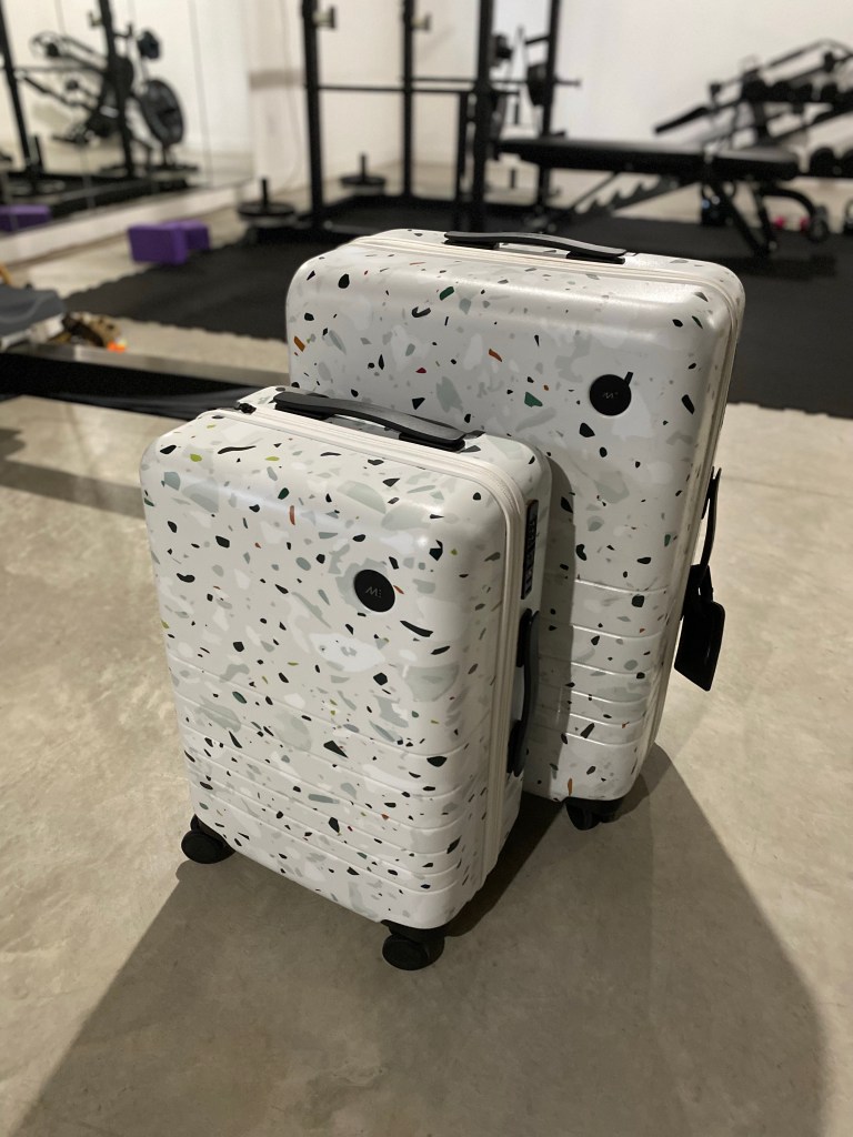 I’ve had my fair share of luggage disasters. See previous posts on how I had to buy new luggages in the middle of the trip due to these disasters. We now have the Monos carry-on and medium sized suitcases in a cute Terrazzo pattern. It’s very lightweight, looks super sleek but also very sturdy.