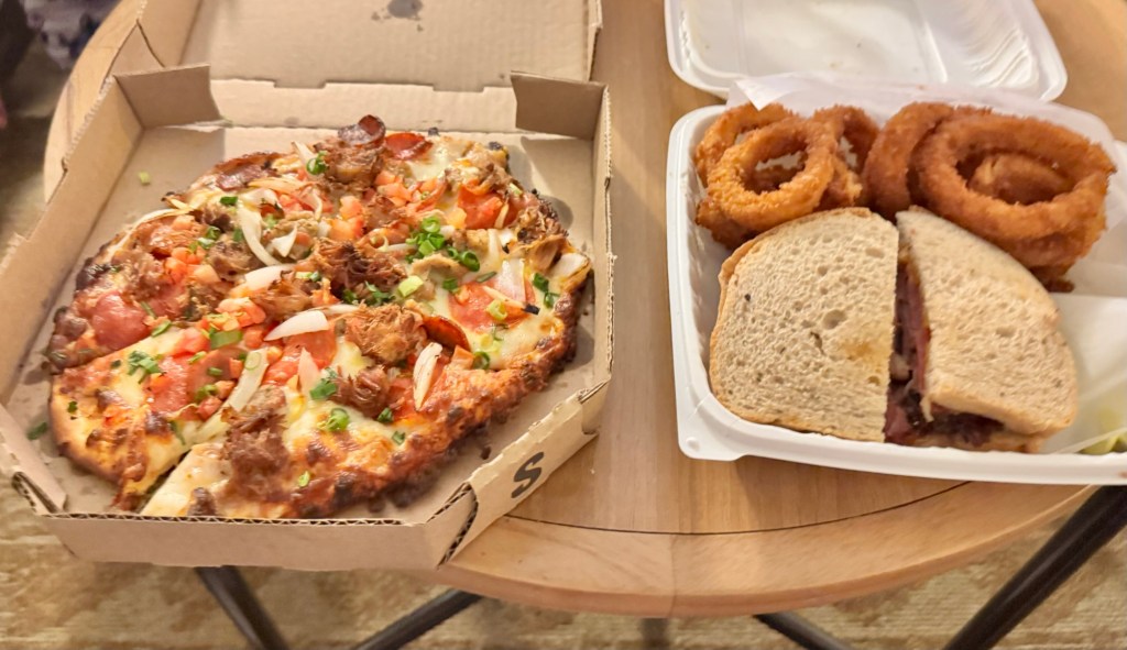 We had an exhausting travel day so after some pool time and enjoying the complimentary cocktail hour, we decided to go back to our room for some “room service”. Although they did not have actual room service, they did have some arrangement with 2 restaurants close by with discounts +/- delivery to our room. When we called, however, they said that delivery was going to take too long so we opted to order then go pick it up ourselves. Unfortunately, Aaron still had to wait downstairs for quite a while before the food was ready and by that time, our little one was in major over-tired territory. So my tip is, if you’re planning to order “room service” here, to do it much in advance. The food itself was actually quite tasty. Their onion ring was solid. Their wagyu sandwich was scrumptious. We also had their kalua pig supreme pizza which was very unique and tasty.