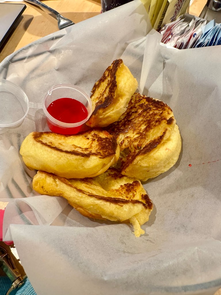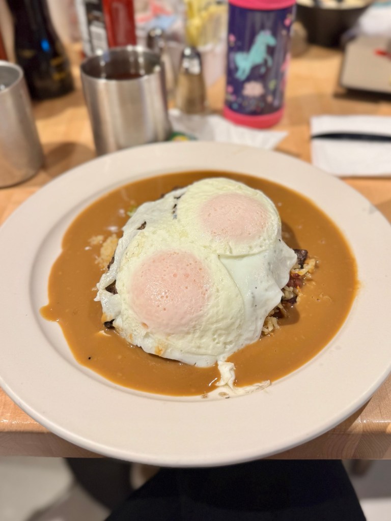 It was a rainy travel day for us. We opted to skip the hotel breakfast today to enjoy breakfast at Liliha Bakery. I haven’t had any loco moco yet this trip so I had to order it. It was lovely. The eggs were cooked to perfection, the patty was generous and the gravy was flavourful. Aaron really enjoyed their chicken waffles. And they gave us some buns with sauce before our meals arrived and those were amazing. The sauce reminds us of jelly donut filling.