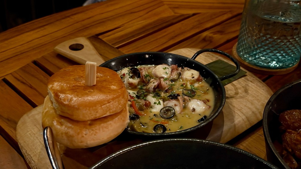 We had our first dinner experience at Chao Pescao, since we saw that they had live music that evening. We loved the ambiance and the food was excellent. They specialized in Latin American and Caribbean cuisine. Their menu was fun with a picture of a map and the dishes corresponding to each of the areas. We had ordered the al ajillo prawns from Mexico, rice and beans with chicken from Costa Rica, roasted octopus from Chile and sugar cane brisket from Columbia. Our favourite was the brisket and chicken. We ordered some fun cocktails but what we were impressed by was their fresh mango juice. It tasted like the actual fruit and was very refreshing. We had ordered the tostadas off the kid’s menu and we couldn’t help but to snack on it as well. We appreciated that they had a colouring book and pencil crayons to keep our little one entertained.