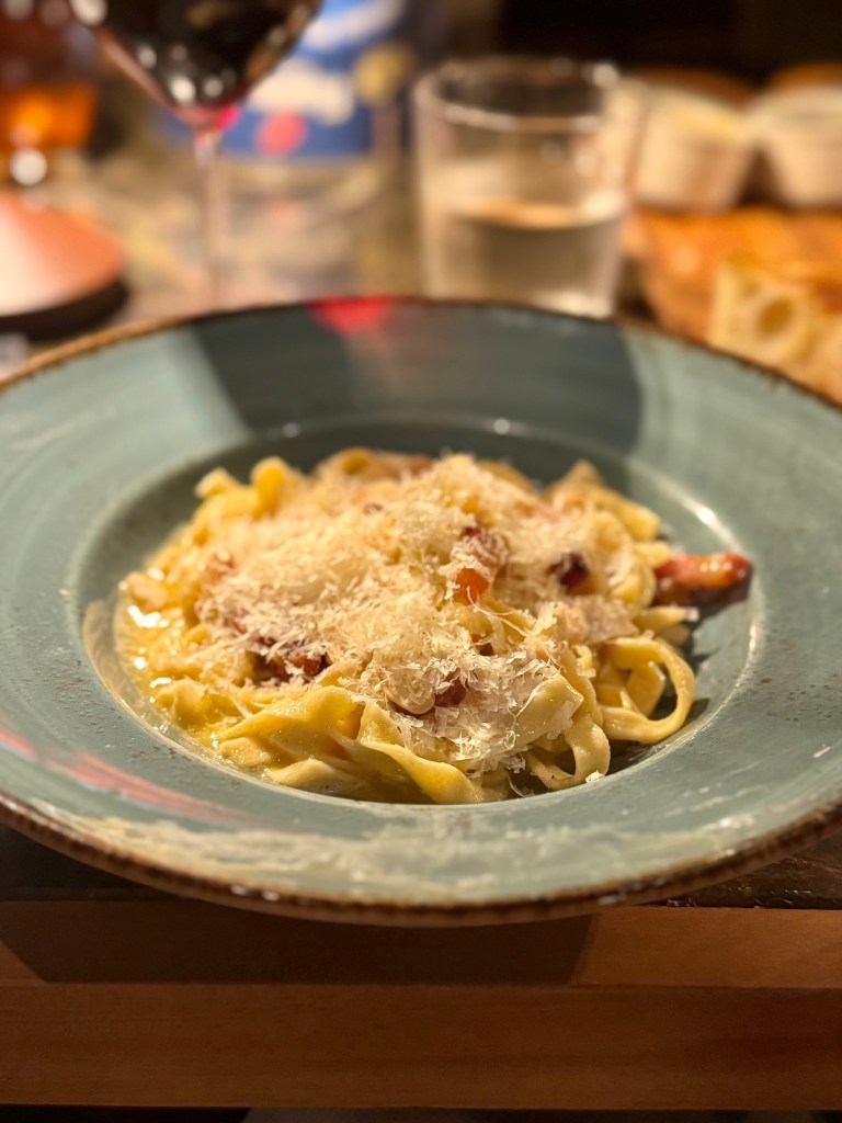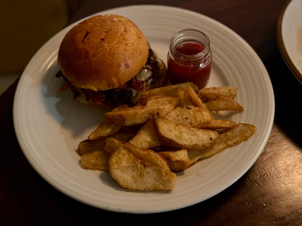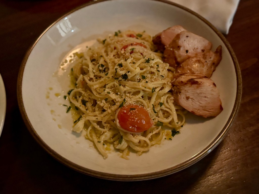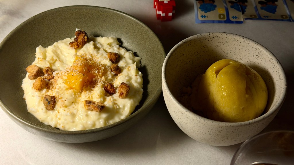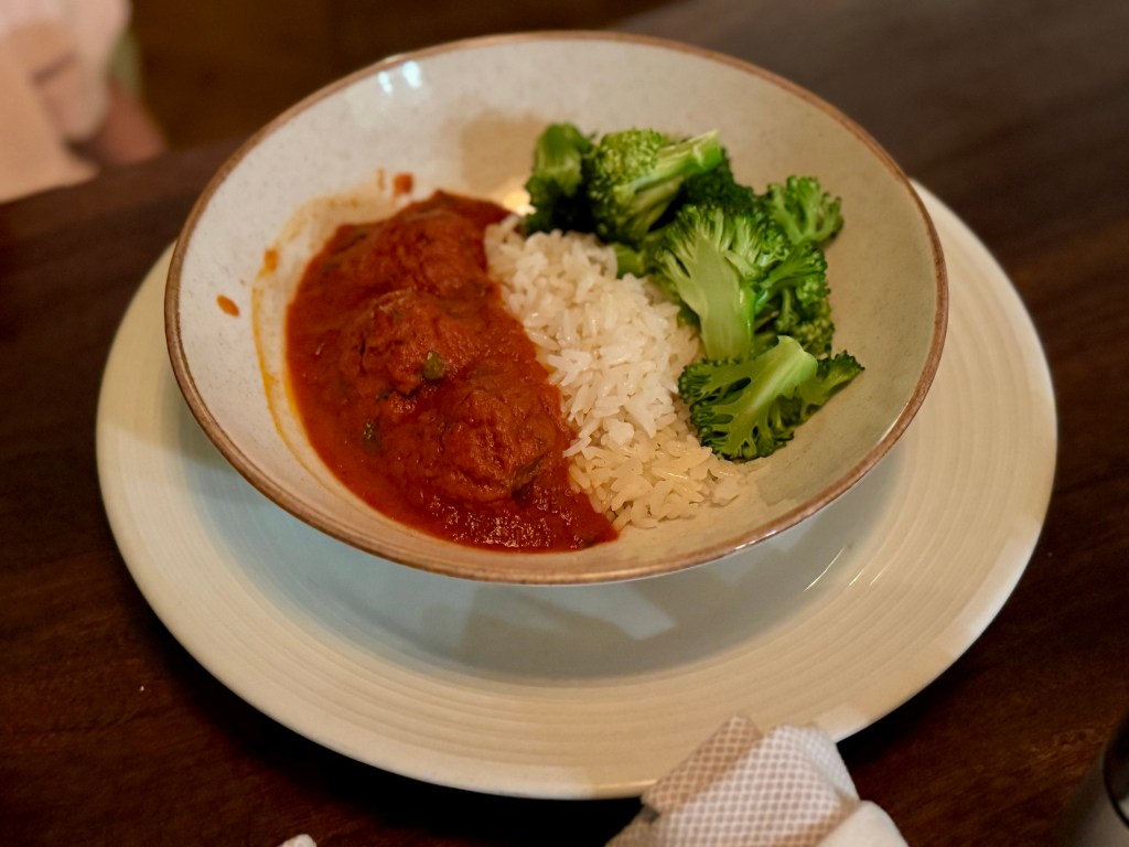 We ordered in-room dining one evening and had their linguine agilo e olio, burger, and meatballs with rice and broccoli (kid’s menu). For dessert, we tried their peach tart with vanilla ice cream, as well as coconut sorbet. The food was standard with the ice cream’s texture being a bit off. The burger and coconut sorbet were excellent.