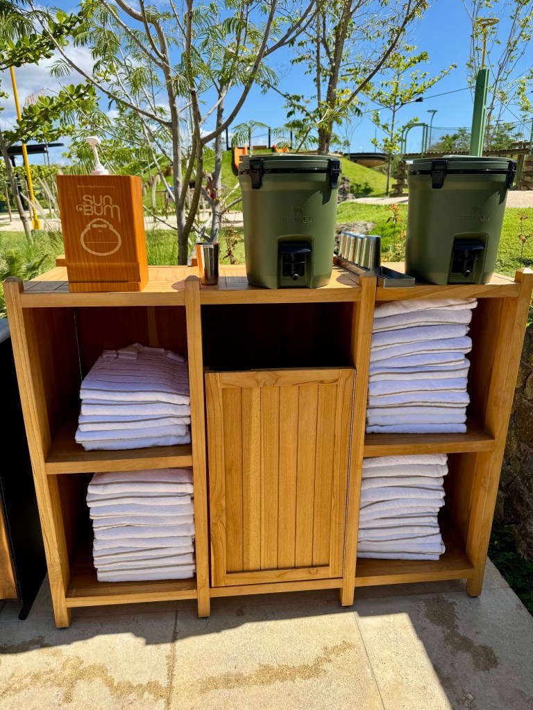 There were multiple pools on site with one being adult-only. There was a zero-entry pool but we found the water temperate a bit cooler, so we mostly stayed at a smaller pool close to Gaio, which was warmer. There were no life jackets or floaties available, so remember to bring your own if needed! We found out at the end of our stay that there was one floatie available to borrow from the kid’s club but it was only one, so again, it’s better to just bring your own. They did have water stations with plenty of clean towels, sunscreen, and insect repellent available throughout the pool and beach areas.